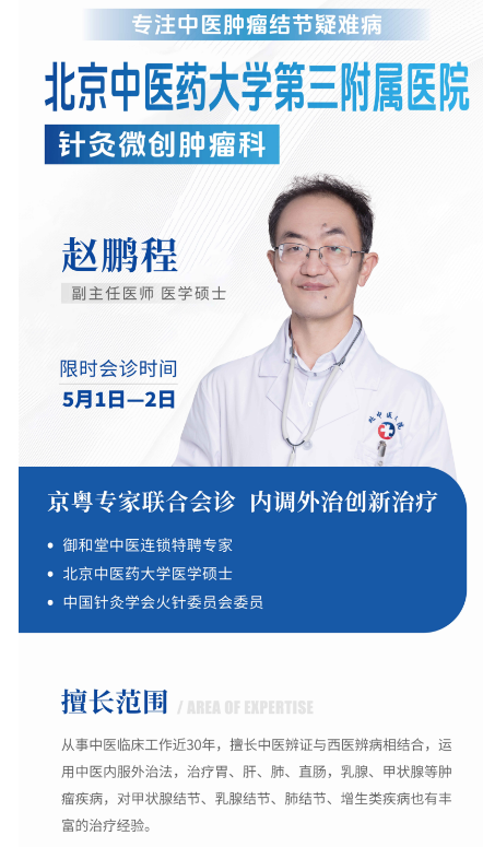 赵鹏程专家深耕中医肿瘤领域多年,擅长以“针灸-微创-中药”,结合现代医学影像技术,精准干预肺癌、乳腺癌、甲状腺结节及复杂疑难病症。其独创的“针灸调控肿瘤微环境”技术,在缓解癌痛、提升患者生活质量方面疗效不错,深受患者信赖。